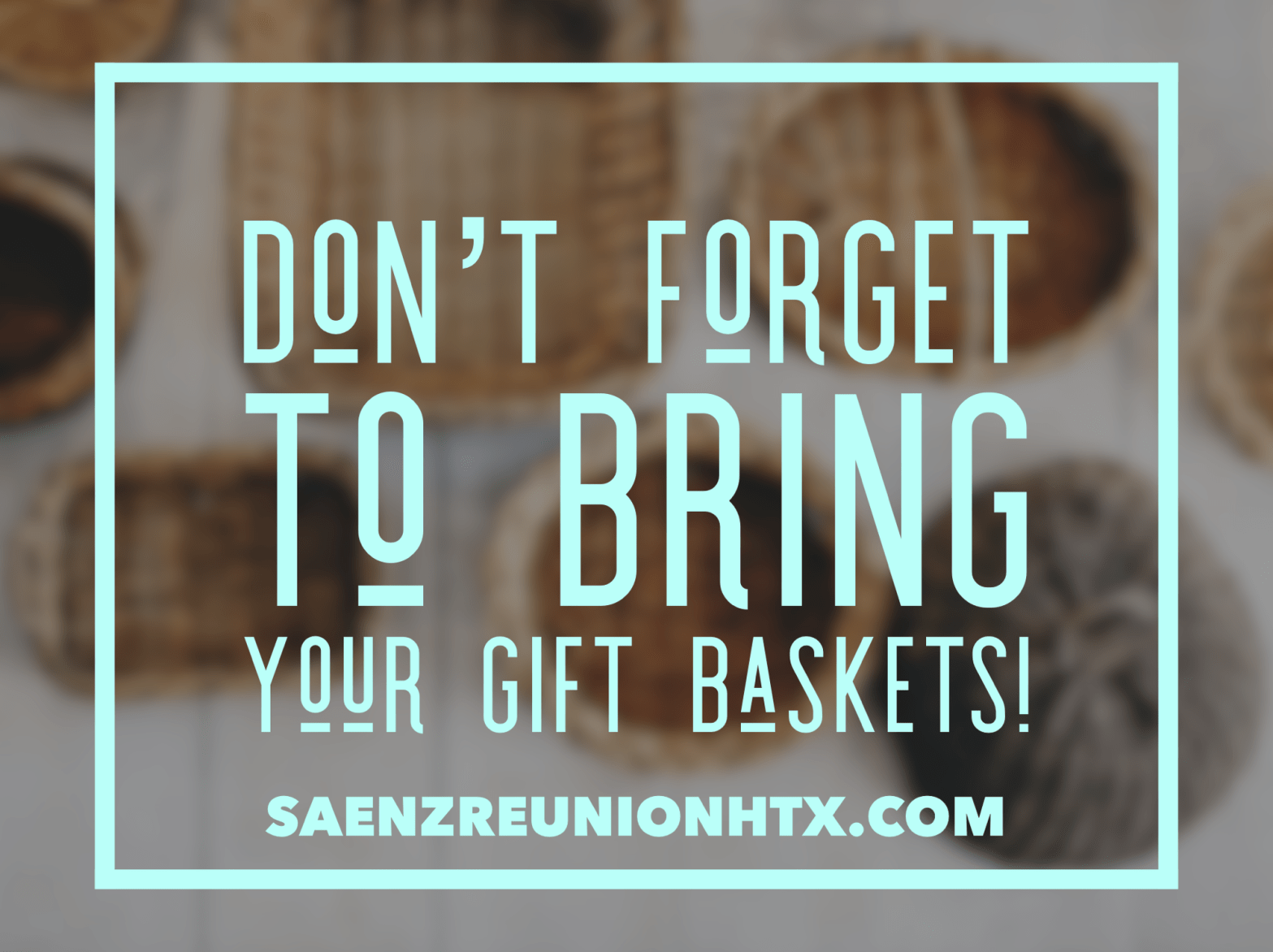 Hey Saenz family! Donāt forget to bring your gift baskets to the Saenz Reunion HTX 2024! Weāre raising money for the Saenz Reunion College Fund, and every little bit helps. The fun begins at noon at the James Driver All-Inclusive Park, 10918 1/2 Bentley St, Houston, TX 77093. Letās make a difference together! š
